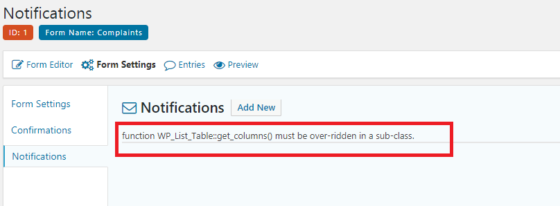 Gravity Form WP_List_Table::get_columns() Error in Notification Tab