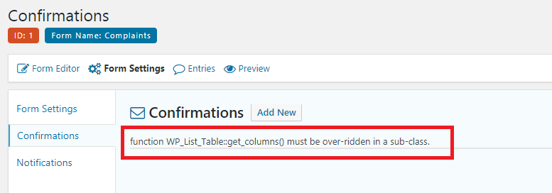 Gravity Form WP_List_Table::get_columns() Error in Confirmations Tab